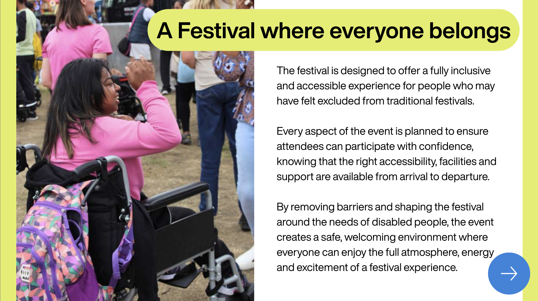 The festival is co-produced with disabled people and shaped by a steering group of disability-led organisations, ensuring authenticity in everything we do.